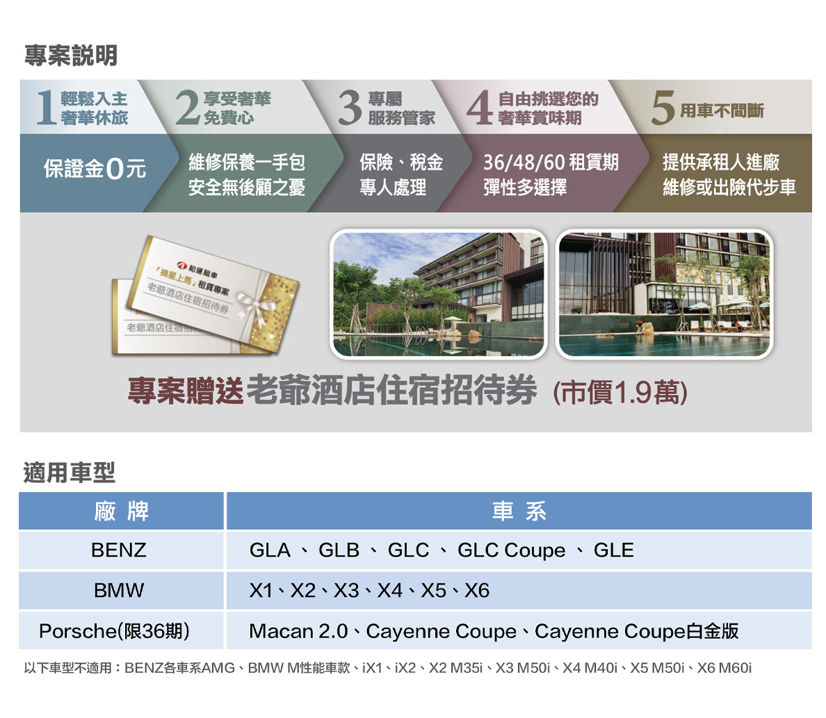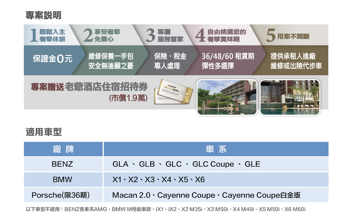 專案內容包含:保養維修、車輛保險、代步車、監理規費及牌照燃料稅。 |
